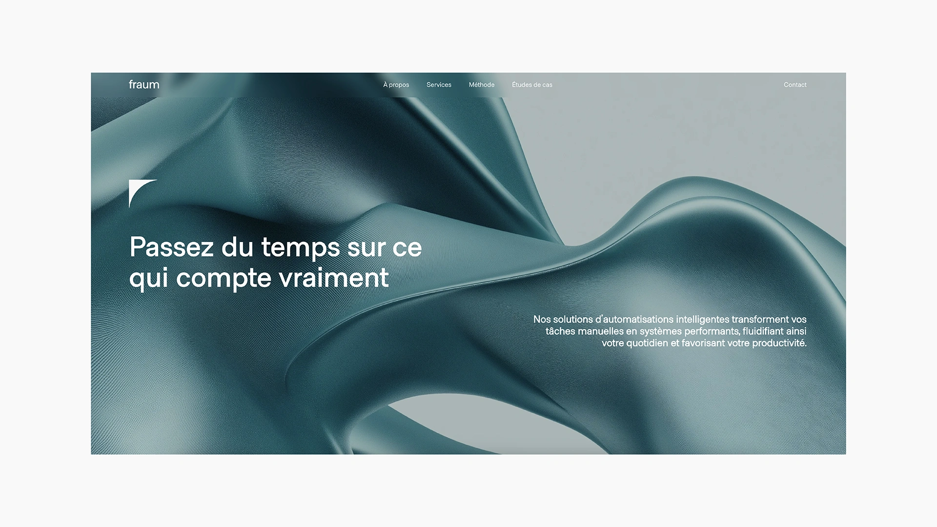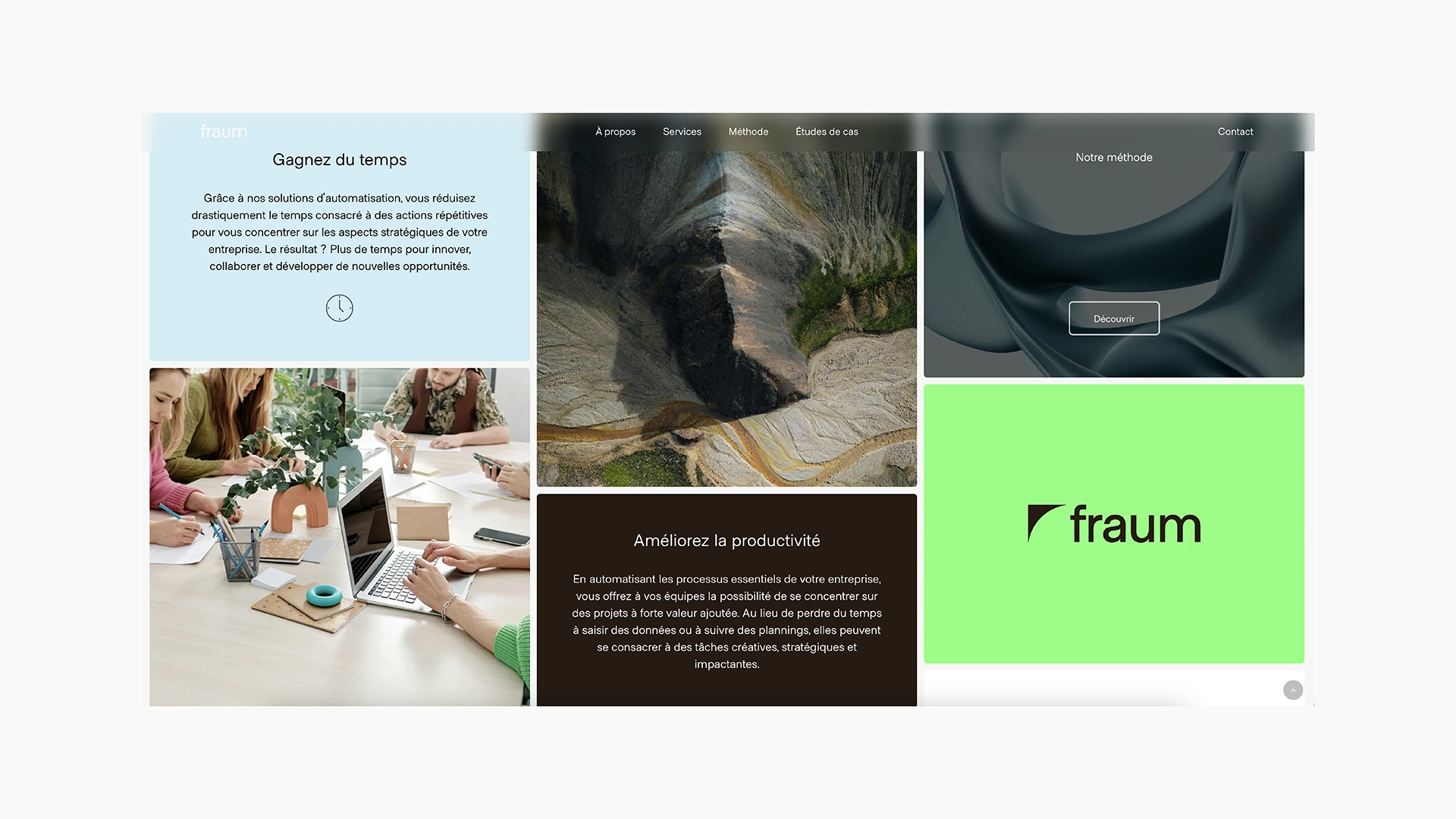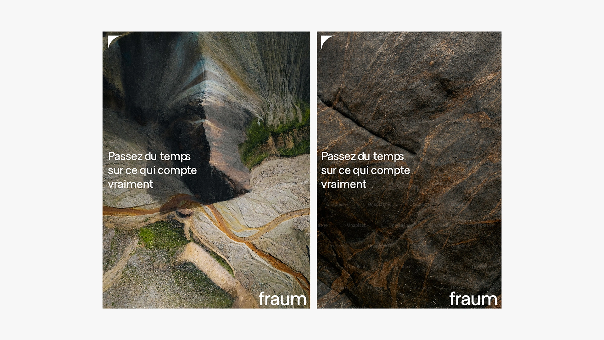 Not In Paris Now accompagne Amine dans la création du naming, du branding et du web design de son projet. L’identité visuelle de Fraum, située entre le conceptuel et le matériel, se construit autour d’une dualité : abstraction et concret, organique et digital, rocheux et fluide. Cette approche vise à dépasser les codes visuels et narratifs traditionnels de l’IA et de l’automatisation, afin de reconnecter ce secteur avec la réalité du terrain et, au final, avec les entreprises cibles, soit toutes celles qui utilisent des outils numériques.