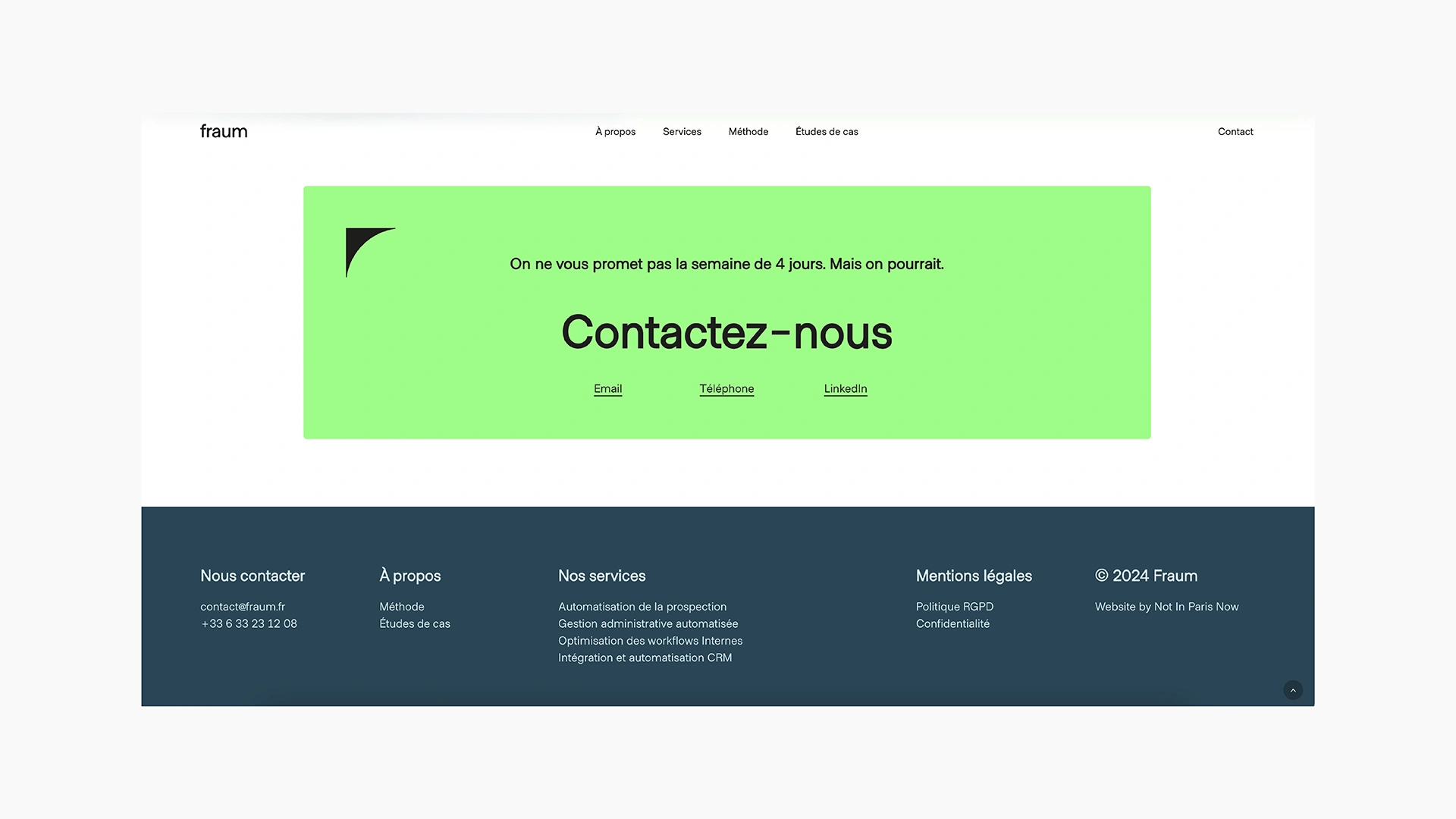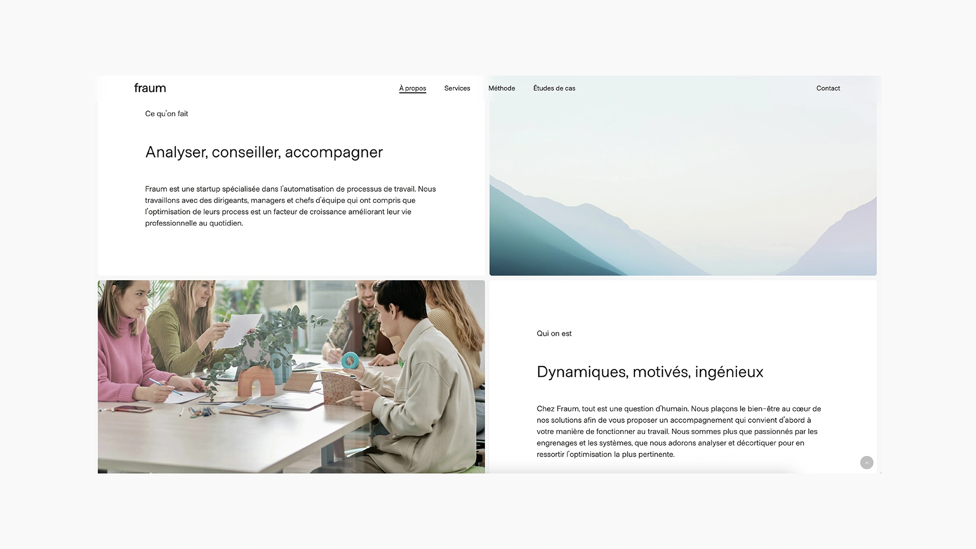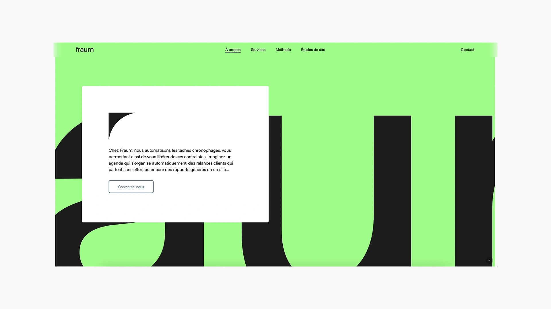 Not In Paris Now accompagne Amine dans la création du naming, du branding et du web design de son projet. L’identité visuelle de Fraum, située entre le conceptuel et le matériel, se construit autour d’une dualité : abstraction et concret, organique et digital, rocheux et fluide. Cette approche vise à dépasser les codes visuels et narratifs traditionnels de l’IA et de l’automatisation, afin de reconnecter ce secteur avec la réalité du terrain et, au final, avec les entreprises cibles, soit toutes celles qui utilisent des outils numériques.