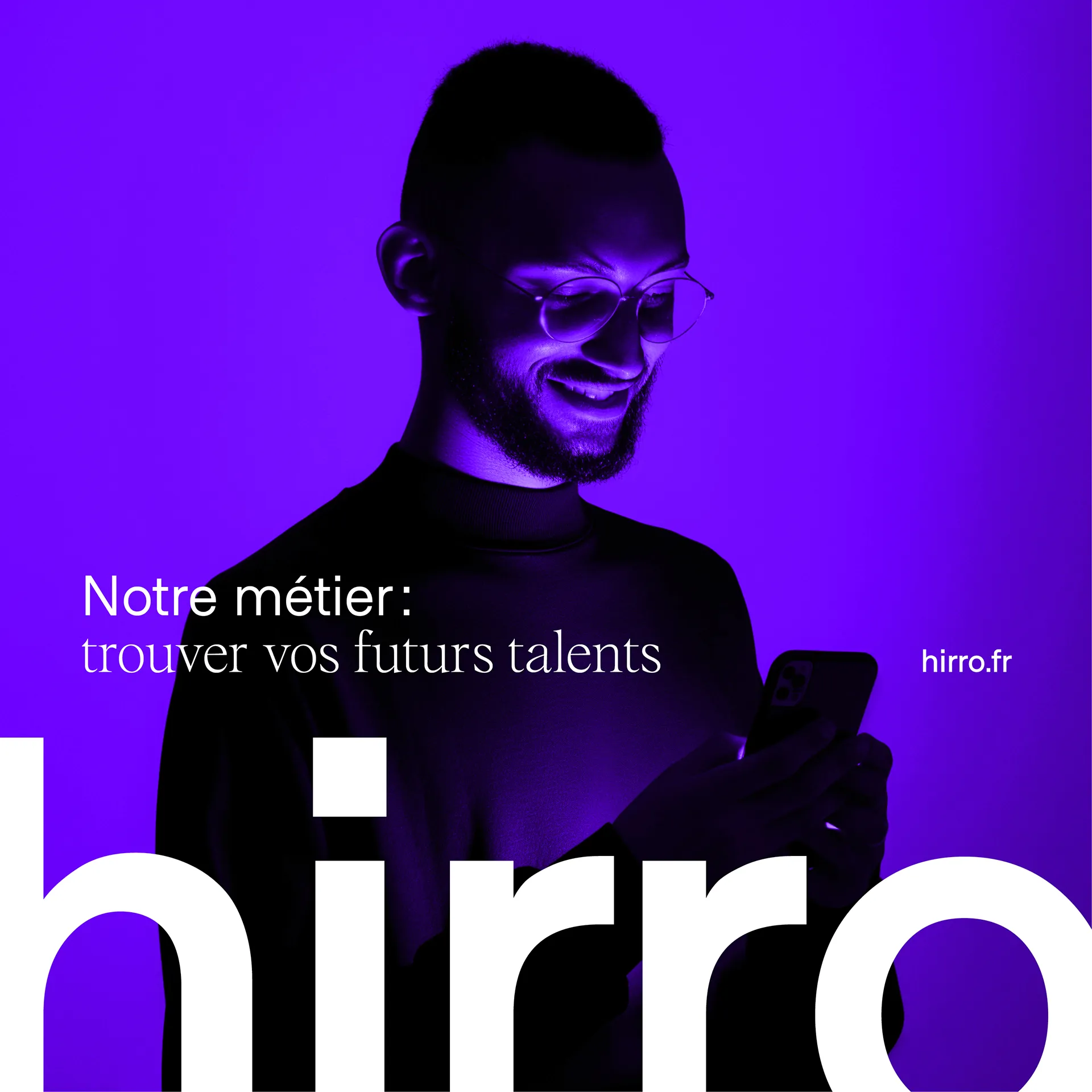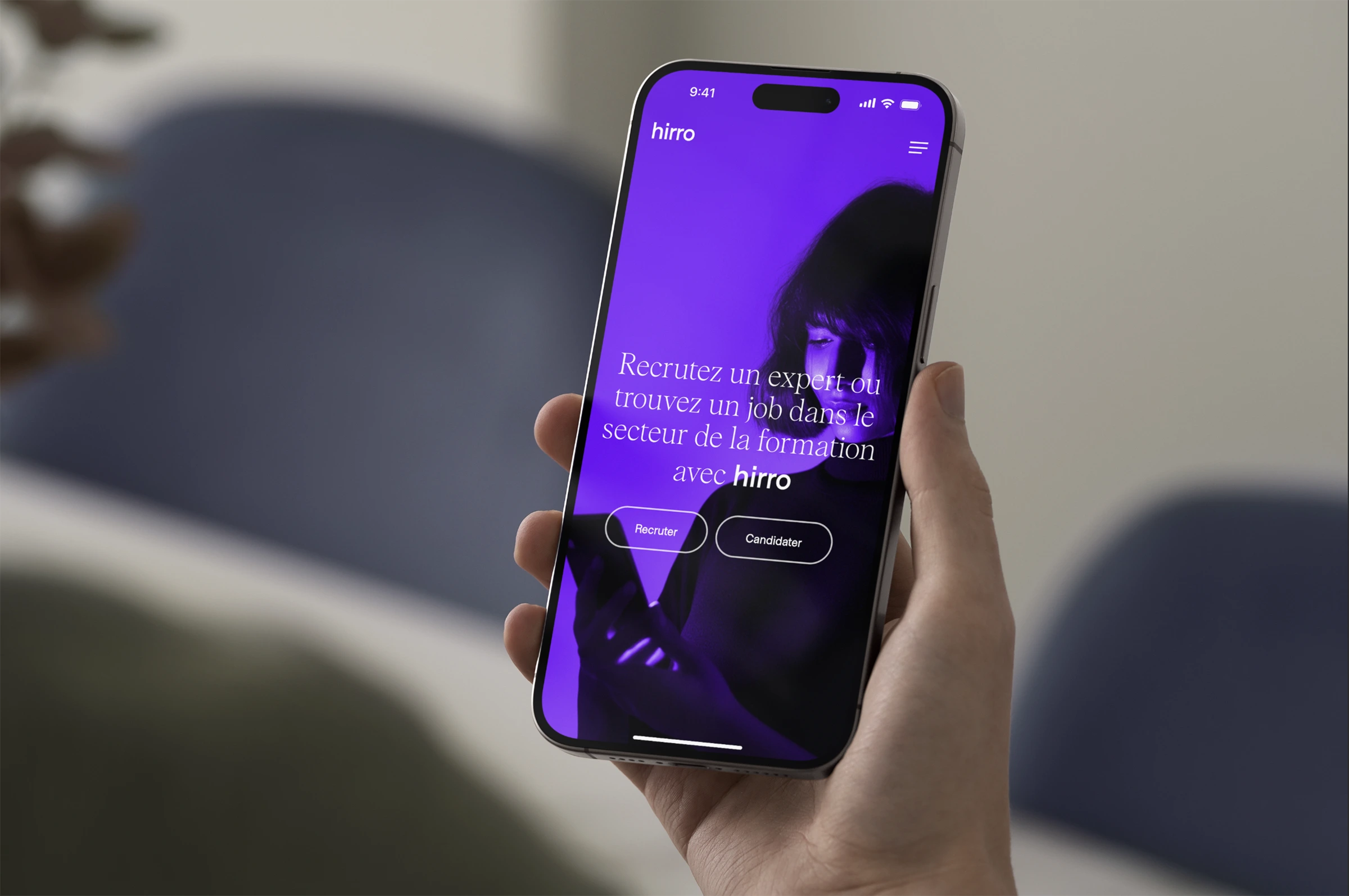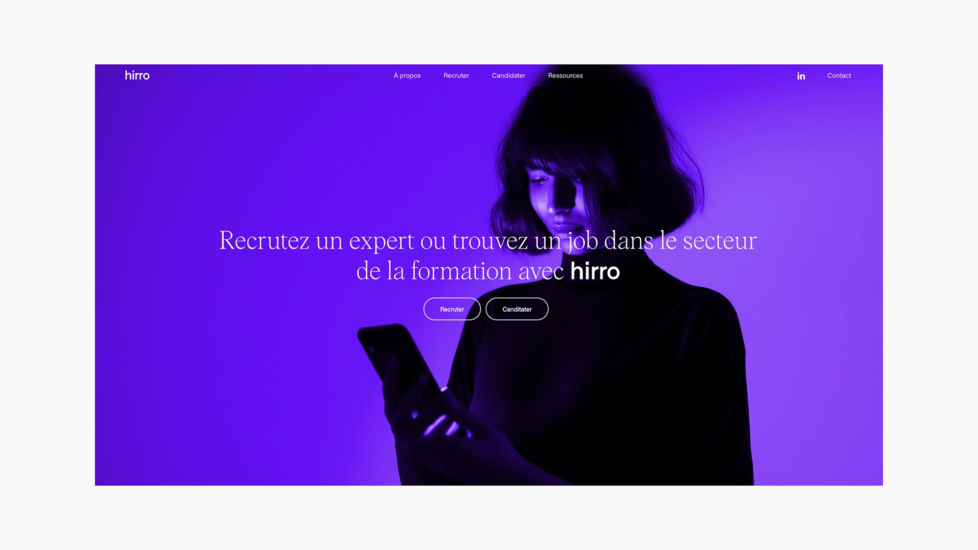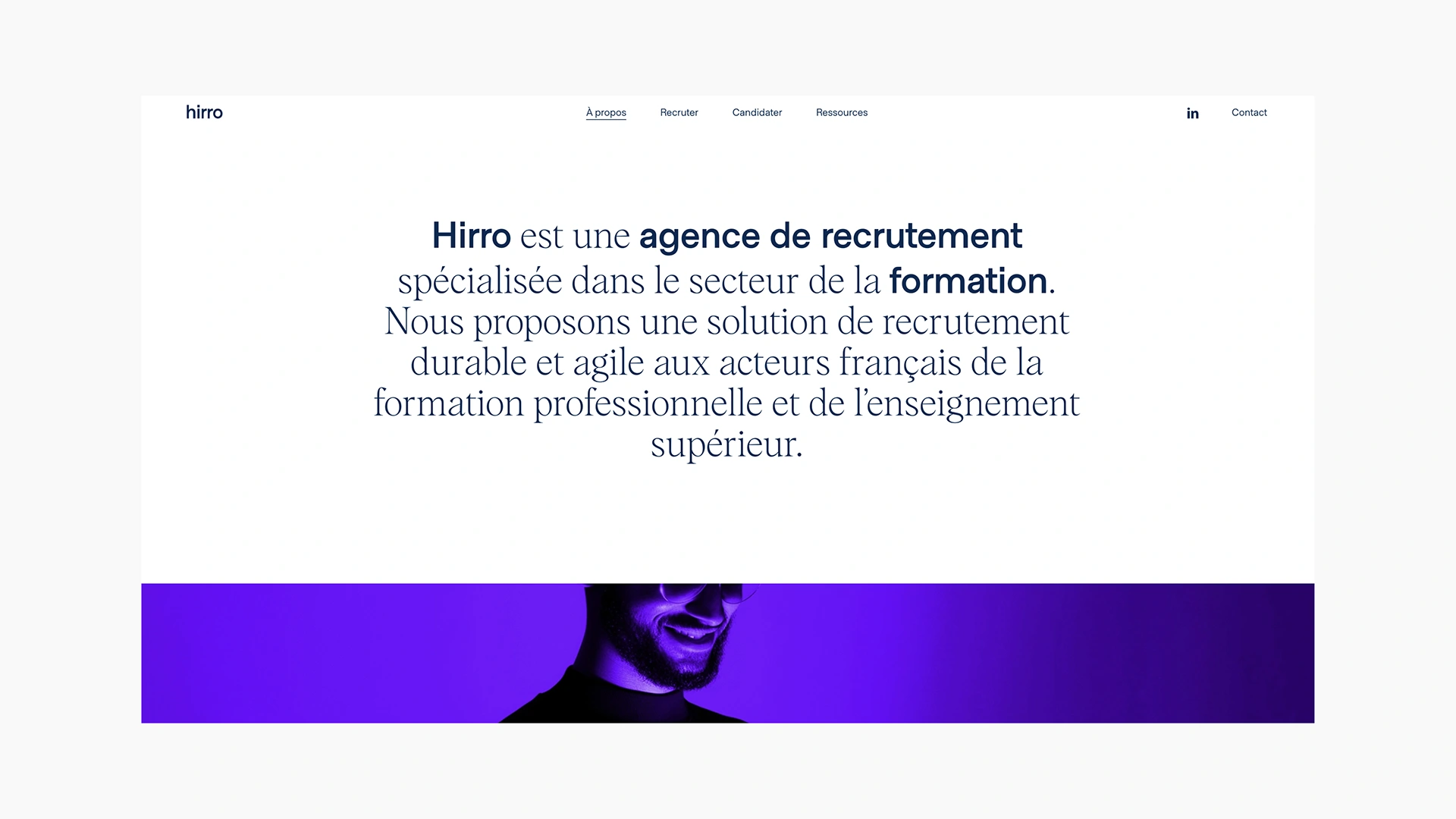 L’identité visuelle d’hirro se veut sobre, minimale et maîtrisée. Elle met l’accent sur l’emploi d’une iconographie forte et caractérisée, notamment en passant par des portraits plongés dans une atmosphère imprégnée des couleurs d’accent de l’agence. Le système typographique combine deux polices de caractères visuellement éloignées, soulignant à la fois l’aspect contemporain et innovant de l’agence tout en valorisant sa position de leader affirmé dans le secteur de la formation.