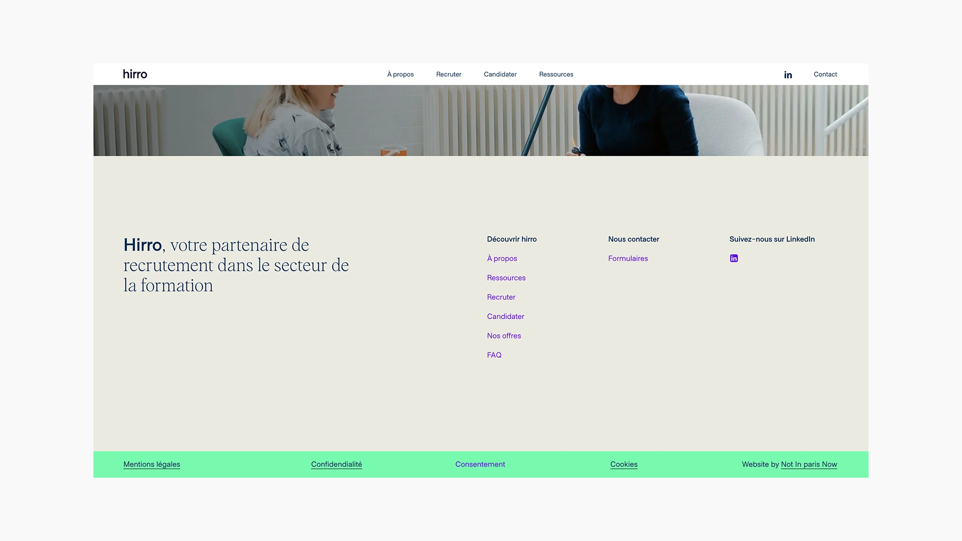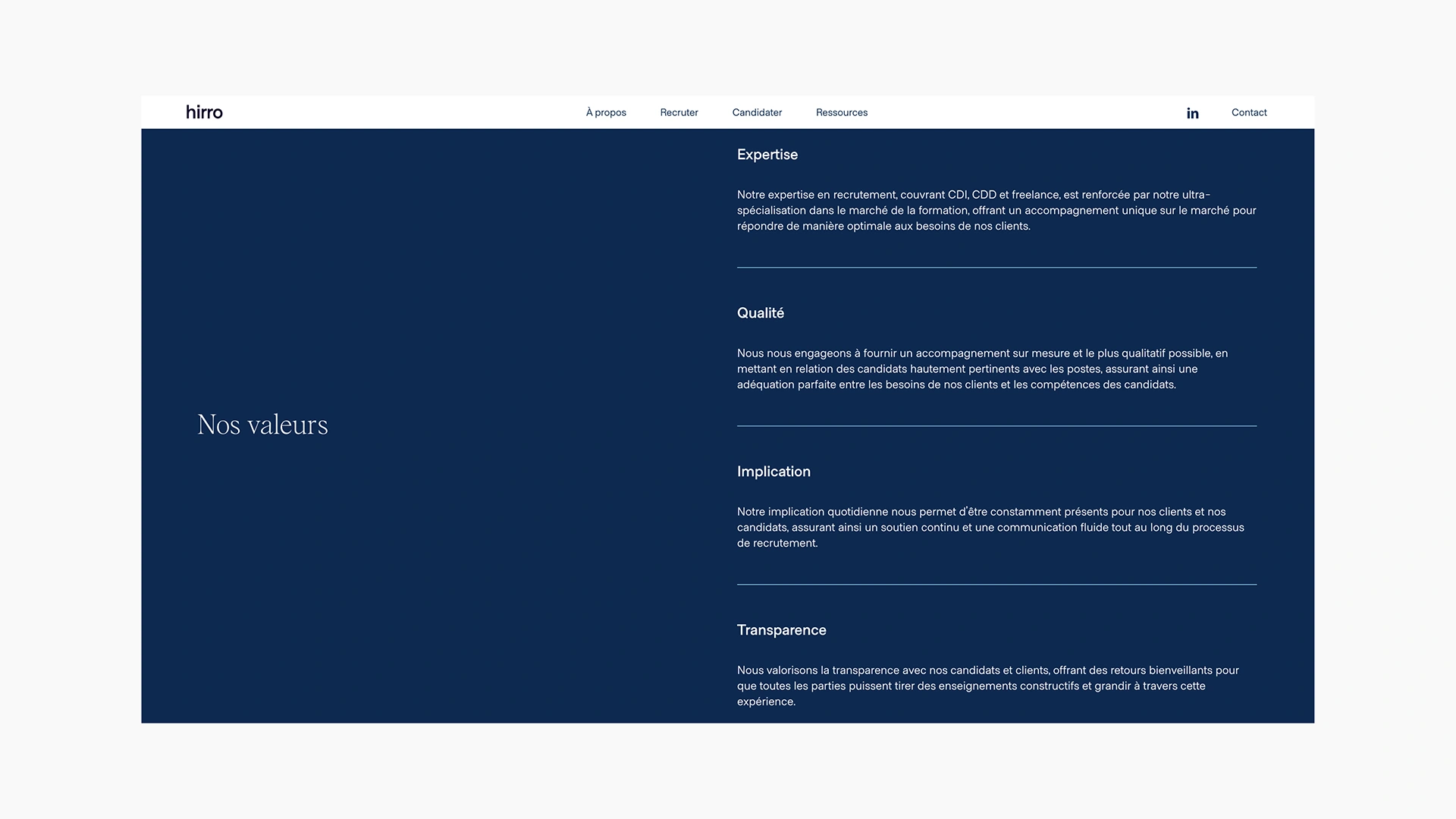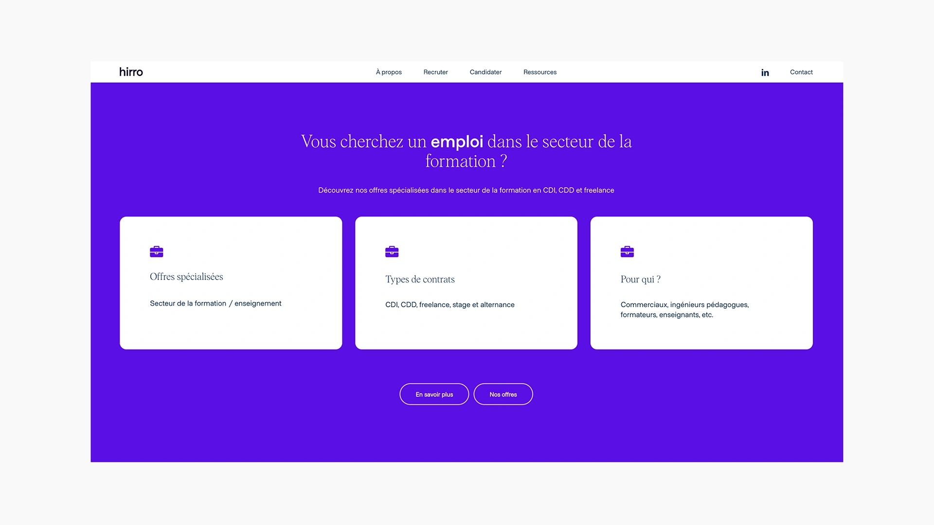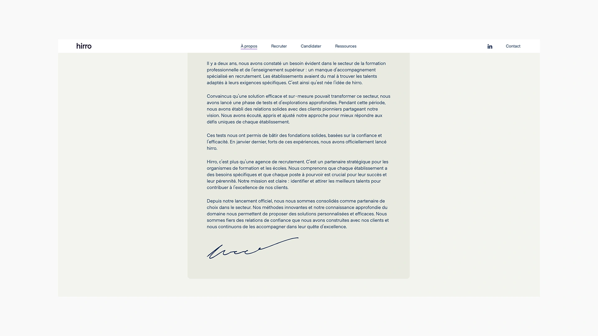 L’identité visuelle d’hirro se veut sobre, minimale et maîtrisée. Elle met l’accent sur l’emploi d’une iconographie forte et caractérisée, notamment en passant par des portraits plongés dans une atmosphère imprégnée des couleurs d’accent de l’agence. Le système typographique combine deux polices de caractères visuellement éloignées, soulignant à la fois l’aspect contemporain et innovant de l’agence tout en valorisant sa position de leader affirmé dans le secteur de la formation.