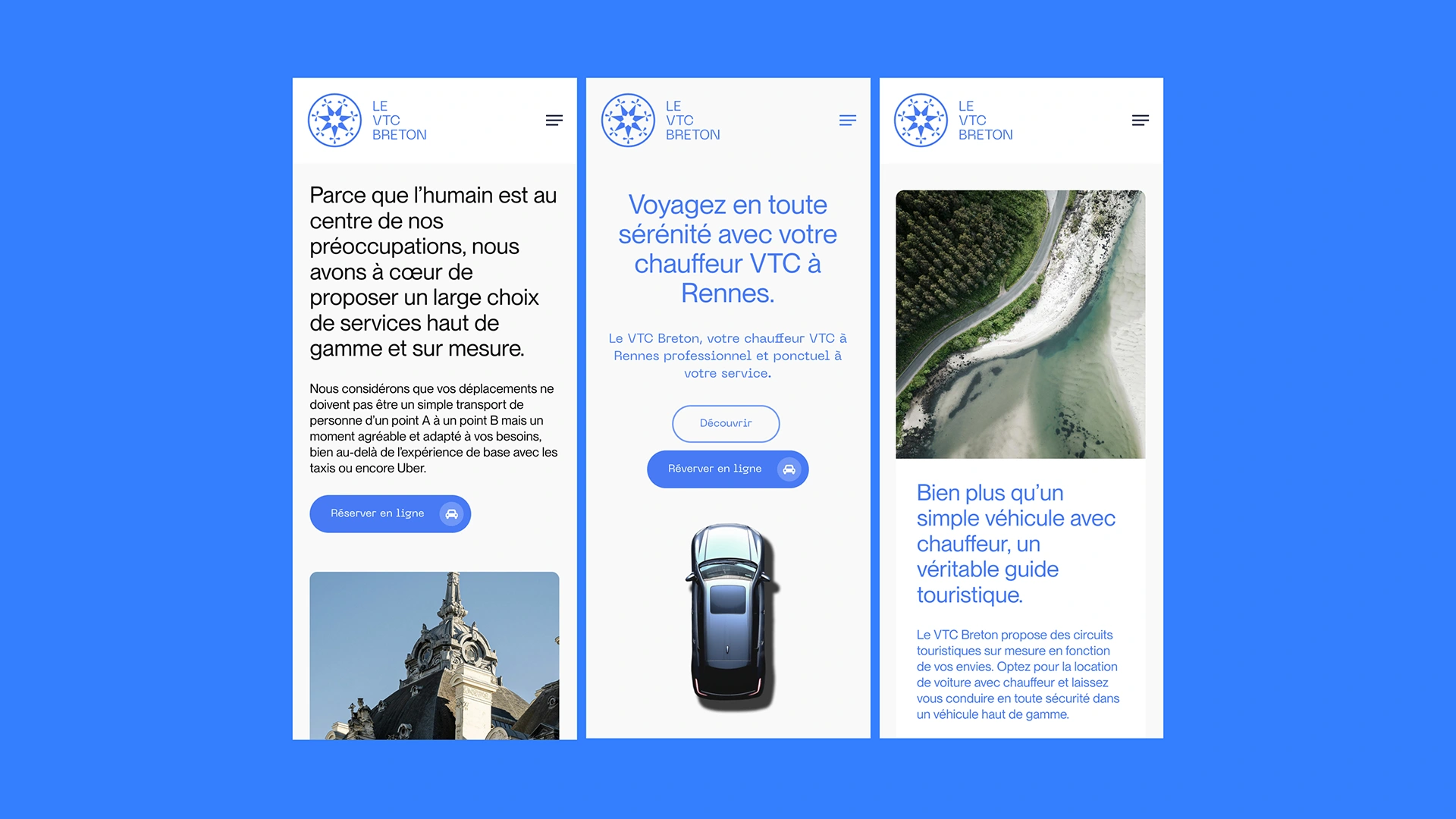 Loin des clichés de l’automobile et du costard-cravate encore trop utilisés dans les branding de VTC, notamment sur le territoire Rennais, nous décidons d’accentuer la portée culturelle inhérente au VTC Breton et à son territoire. Nous dessinons un logo rappelant la circularité de la roue d’un véhicule tout en utilisant l’Hermine, symbole phare de la Bretagne.