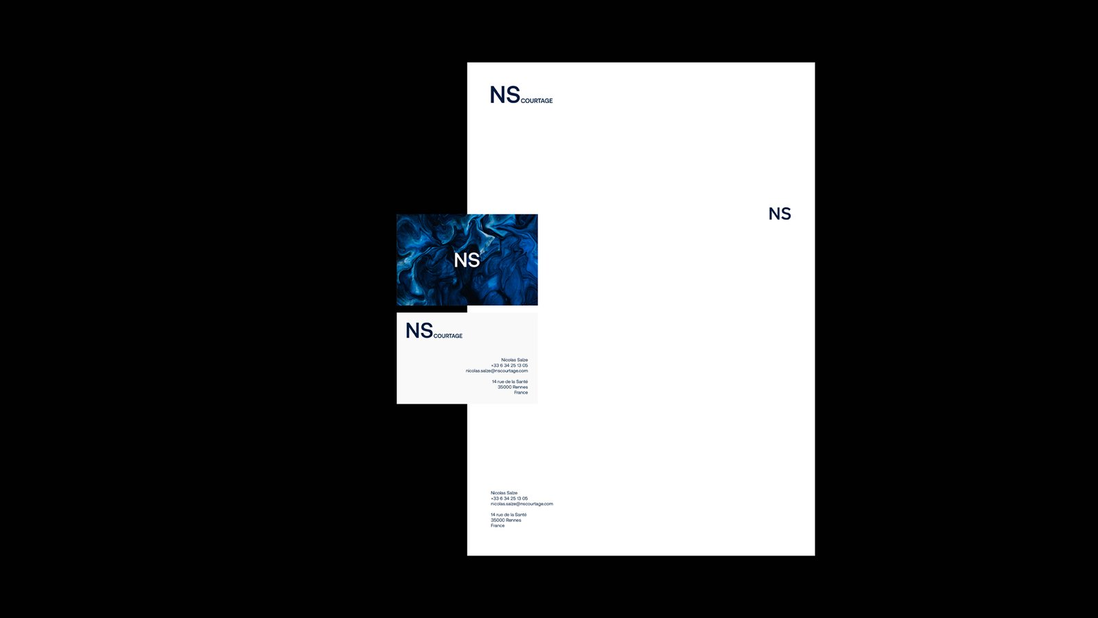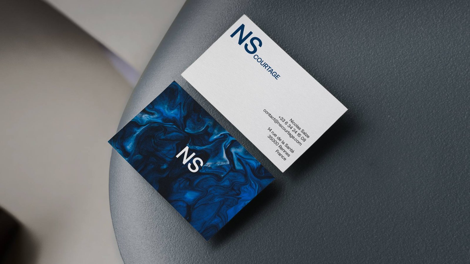 L’identité visuelle de NS Courtage est construite autour du déploiement d’un système typographique minimal et contemporain incluant une seule et unique police et peu de variations. Cette sans serif néo-grotesque affirme le caractère corporate et financier du cabinet. Le système colorimétrique va également dans ce sens en se composant de nuances de bleues plutôt ternes et peu saturées. Enfin, ce sont des fonds de textures abstraites qui closent les éléments visuels de l’identité. Ce choix iconographique apporte une aspérité visuelle novatrice pour un cabinet de courtage.